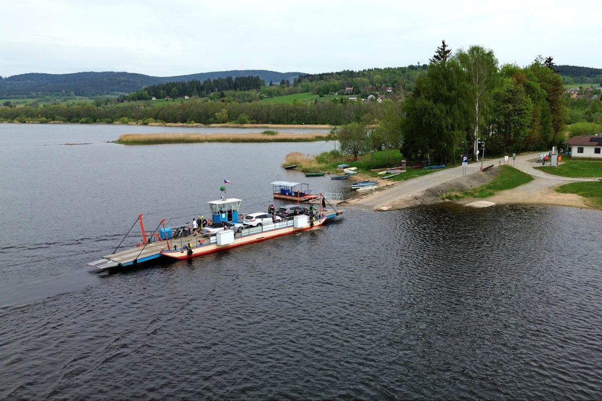 Juist toen we aankwamen bij de helling trok de pont zich los. Volgens een schema op het informatiebord zou de volgende afvaart pas een uur later zijn. We wilden dat niet zomaar geloven en vroegen een sympathiek ogende Tsjech, die ook op de valreep de boot had gemist, of het echt zo was. Volgens hem klopte het vaarschema zoals wij het hadden gelezen. Dat wetende overwogen we of we nog wel naar de overzijde wilden.